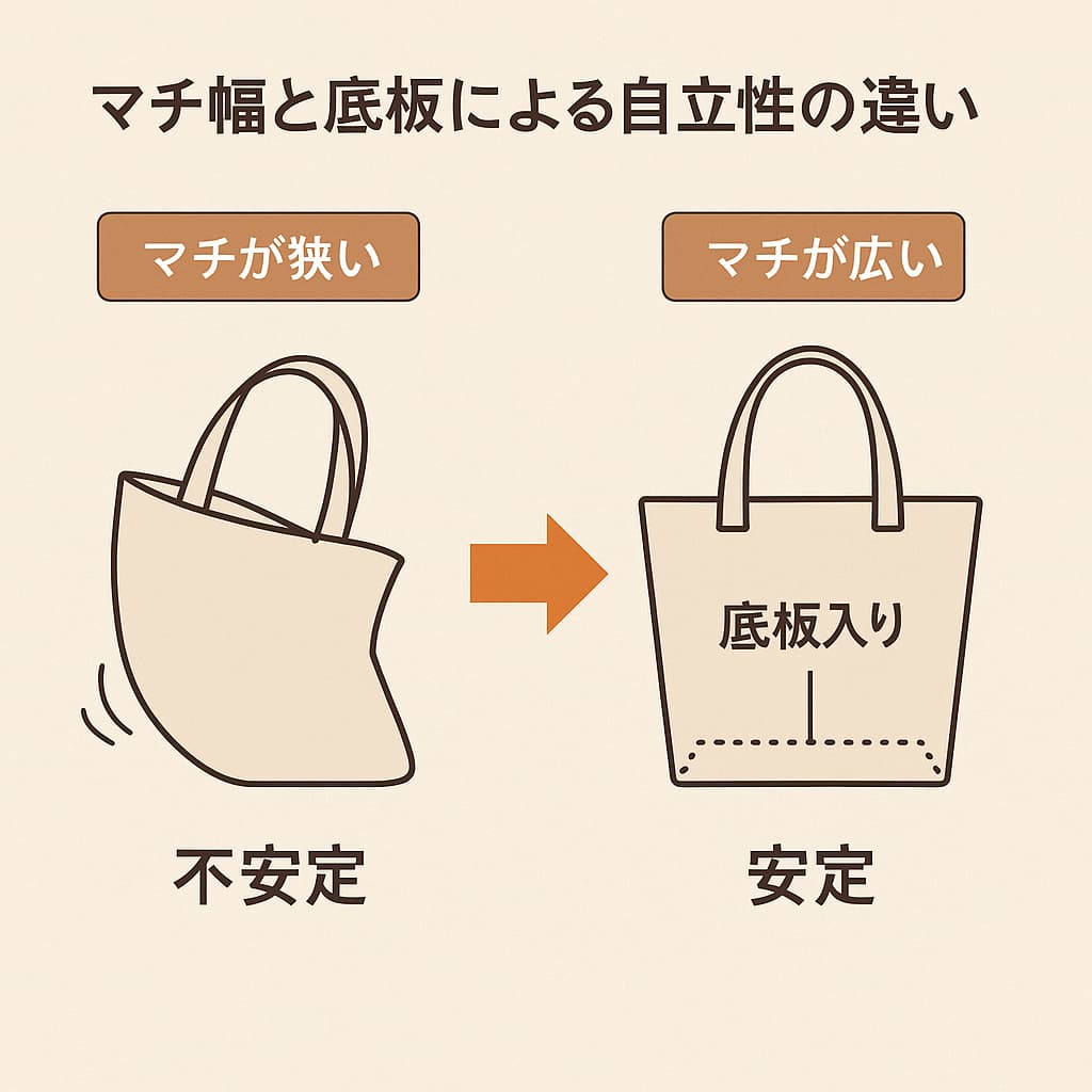 底板+広めのマチという組み合わせは、自立バッグ選びの鉄板ポイントになります。